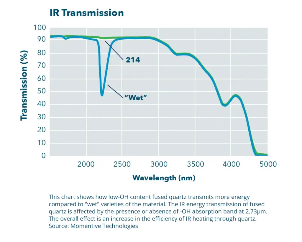 In some cases, like Momentive Technologies’ 219™ fused quartz, intentional doping with elements like titanium enhances UV absorption, demonstrating the material’s versatility and adaptability. The presence of an absorption band at 245 nm reveals the unique strength of glass made by electric fusion, while the 2.73 μm band reflects the vibrational energy of hydroxyl ions, characteristic of a material formed through “wet” processes. Each subtle shift in the spectrum tells a story of the material’s journey, revealing the delicate balance of purity, innovation, and mastery in its creation.
