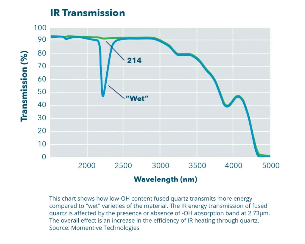 Momentive Technologies’ quartz products have a very low hydroxyl level, which results from the unique electric fusion process. The term Beta Factor is often used to characterize the hydroxyl (–OH) content of fused quartz. This term is defined by the calculation of hydroxyl content from IR transmission.